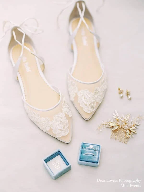 Alicia ballerina shoes for wedding wear are from the ‘Euphoria’ capsule bridal collection. These classic and chic ballerina flats with straps features a hand-sewn illusion mesh upper graced with delicate Alencon lace. The cross ankle straps and lovely tied bows at the heel provide a secure finish and add a feminine touch to an already romantic shoe. Heavy padding ensures all-day comfort.