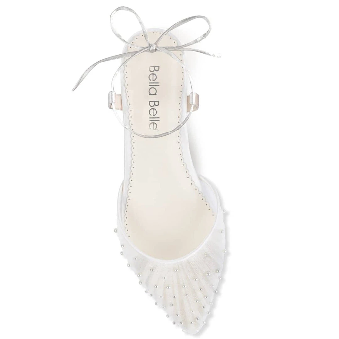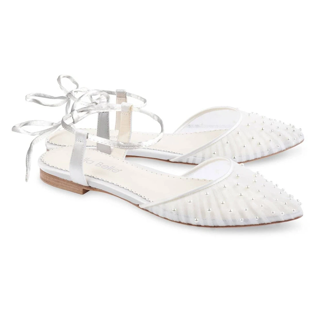 Walk down the aisle in Carina pearl flats for wedding wear. The individually hand-sewn luminous pearls achieve an exquisite scattered effect, on top of hand-pleated tulle. Who knew ballerina pearl flats could be so elegant, beautiful, and comfortable? Tie the straps around your ankles for a graceful ballerina illusion.