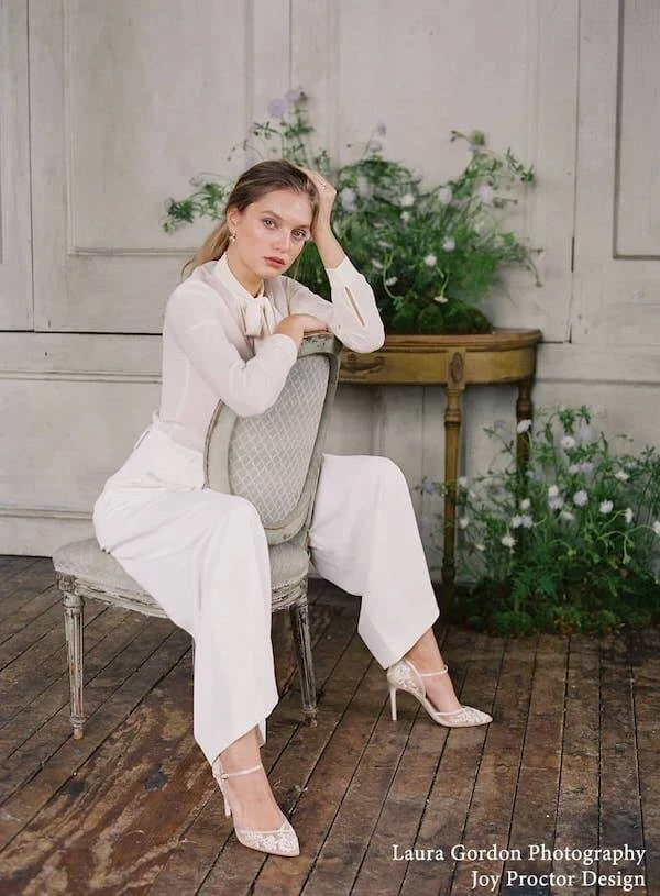 With ivory lace embroidered vines on her nude-colored mesh, Claudia nude lace heels are both romantic and feminine. These D’Orsay wedding shoes are a sexy take on classic pumps as they expose the foot’s curved instep. Add an ankle strap for secure fitting to make Claudia the perfect nude lace shoes for all women.