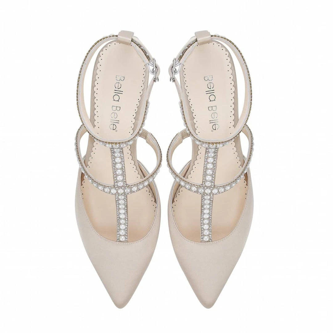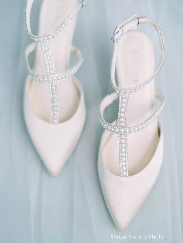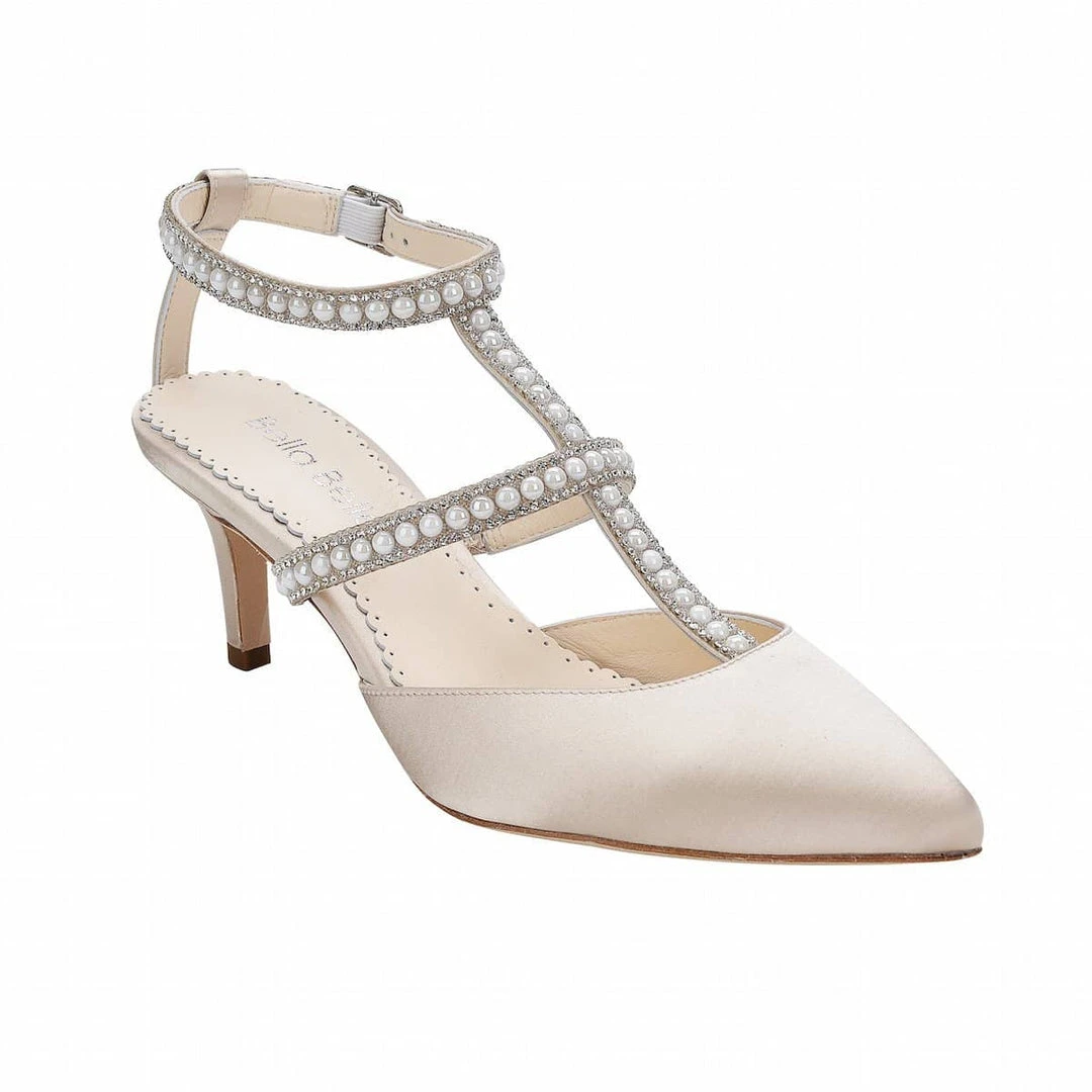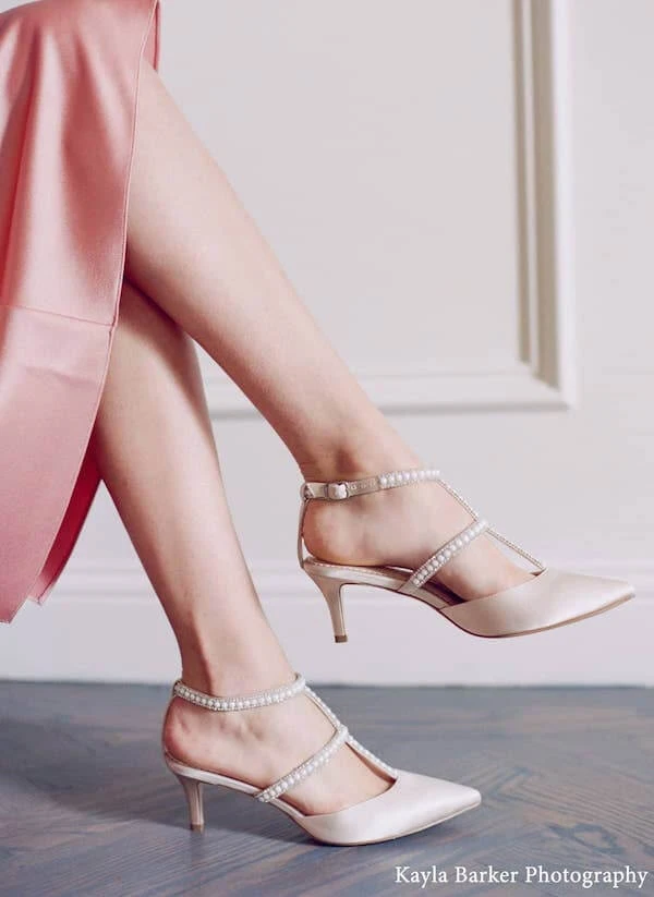 Courtney champagne kitten heels are the perfect combination of comfort and glamor! The sexy pointed toe is cut to reveal toe cleavage, while the T-strap elongates your legs. Classic luminous pearls against glittering silver add just the right amount of twinkle. These evening and champagne wedding shoes low heel pumps offer maximum comfort for all-day wear.