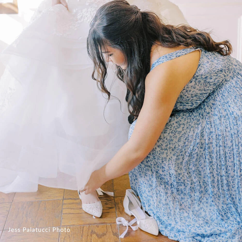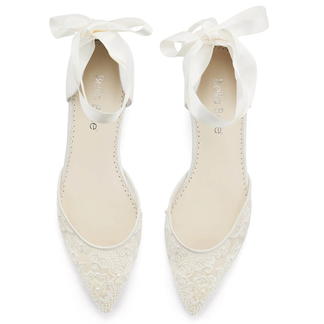 Silky ivory ribbons caress the leg, reminiscent of a traditional ballet slipper on these pearl wedding flats with pearls. Delicately loop the ribbons around your ankle and knot the ends into a trim bow. Only the most discerning observer will spot the pearl beads incorporated into the floral lace design.