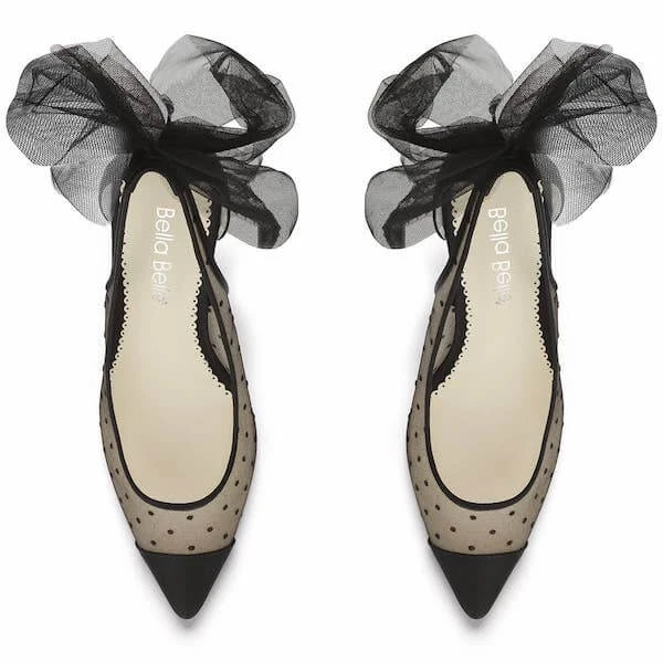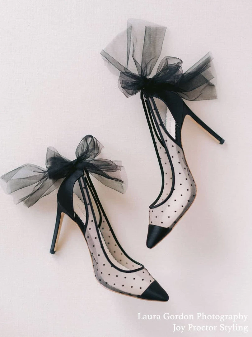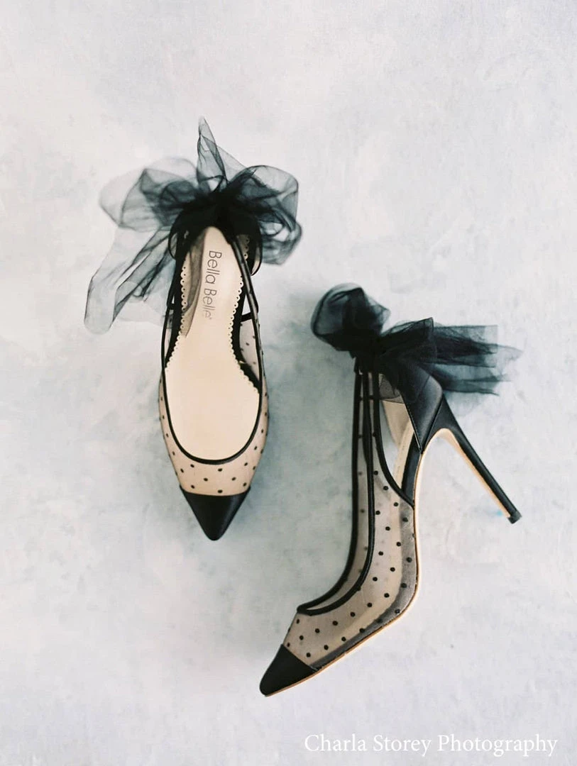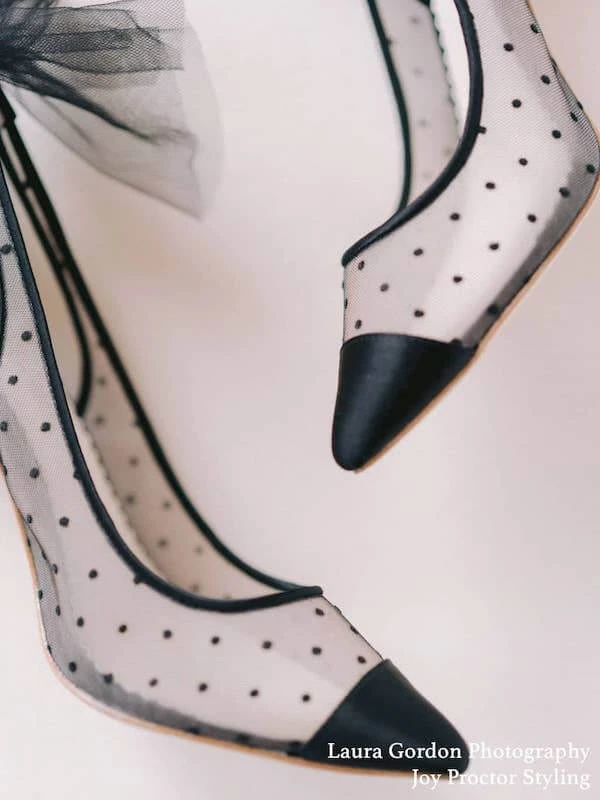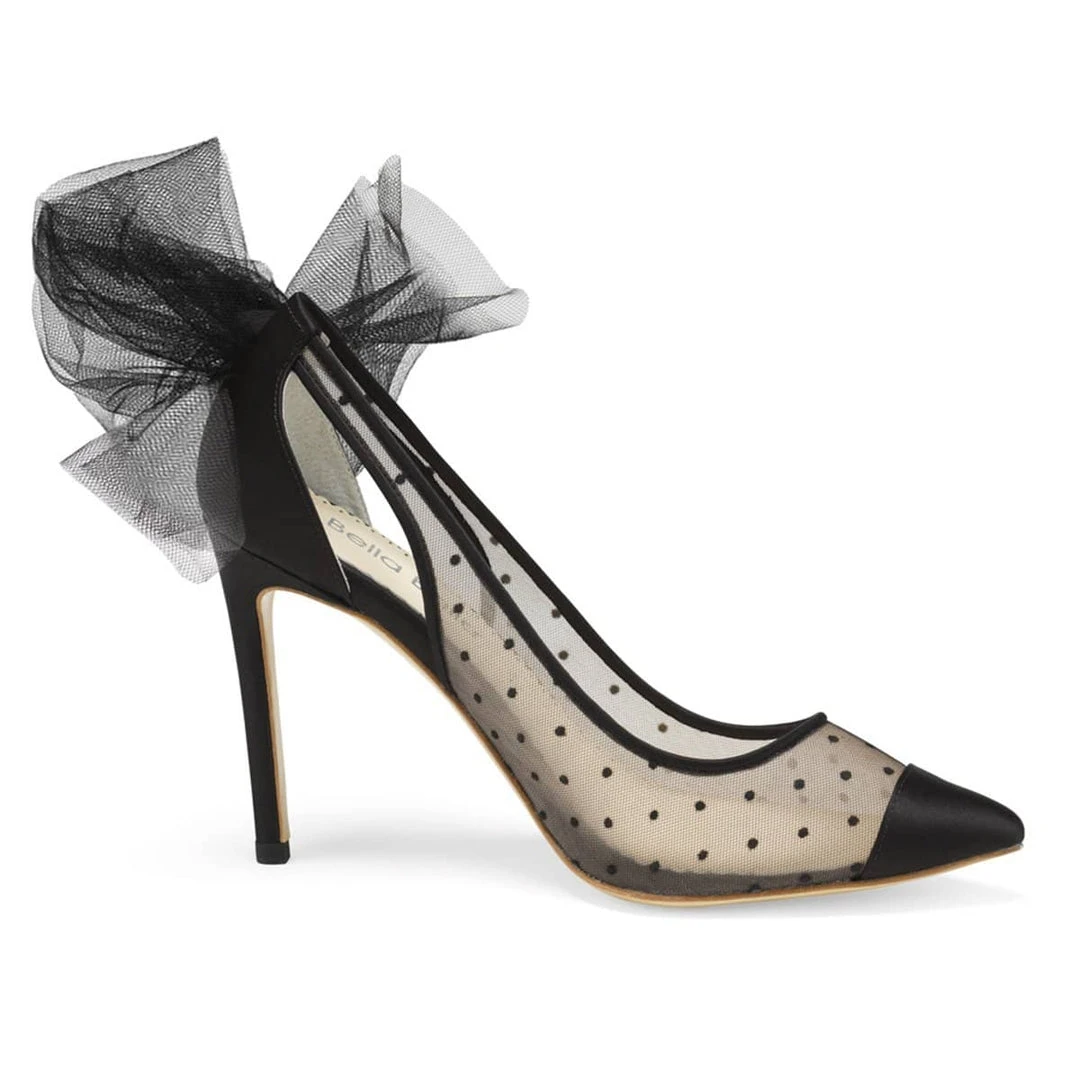 Feminine and sophisticated, our Matilda polka dot high heel shoes feature a chic Swiss dot pattern, capped off with sleek and shiny silk at the toe. Sexy cutouts in the back and an oversized tulle bow break up the lines from toe to heel. Matilda balances soft, sharp, darling, and daring all in one pair of tulle heels.