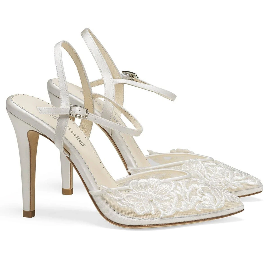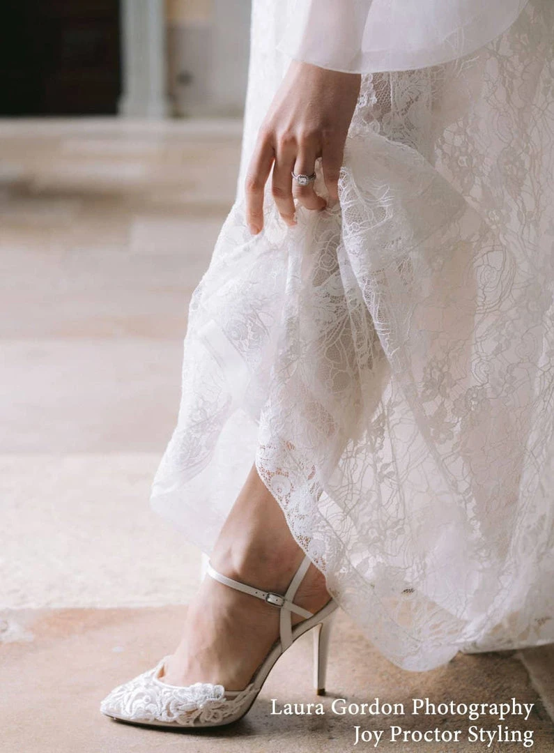 The Maya heel features a romantic floral lace motif and playful interlocking straps at the ankle for an elegant, feminine look. If you look closely, you’ll spy a pearl at the center of each lace flower for an extra luxe touch! The buckle strap ensures a secure fit, while the low-cut vamp gives a hint of toe cleavage.