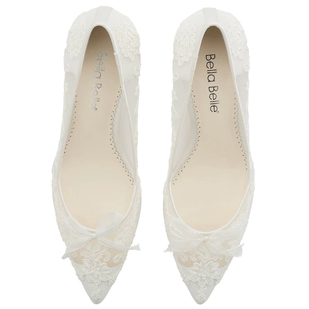 These classic lace low heel shoes are encased in elegant floral lacework that trails from toe to heel. The straight lines create a strong profile, balanced with the elegantly looping pattern. Everything is topped off with a petite bow made of ivory picot ribbon. Create a new wedding heirloom with Monica white flower wedding shoes.