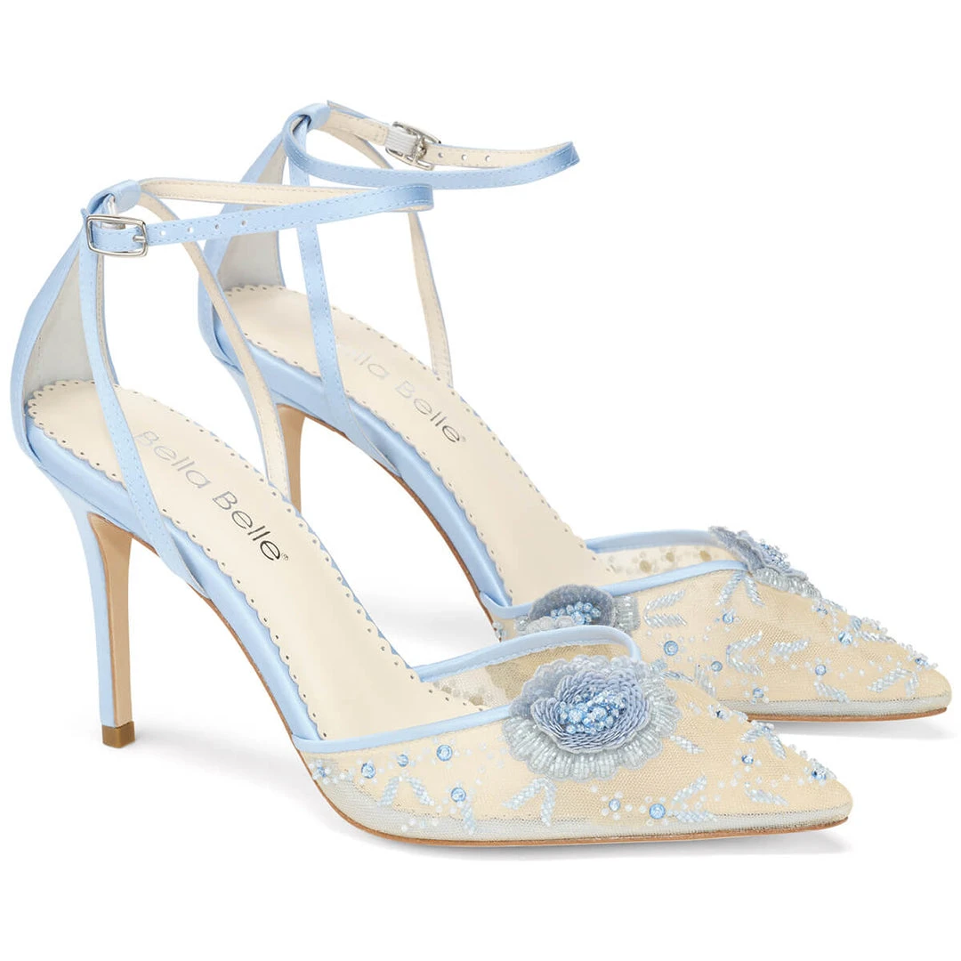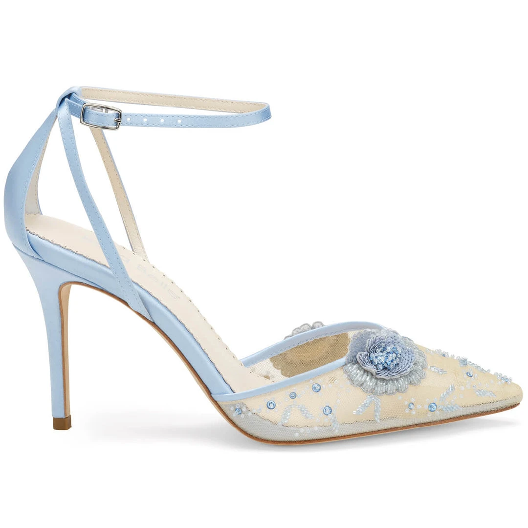 Sequined petals are meticulously stitched together to form two brilliant roses on the toe of Norah, blue ankle strap heels. Shimmering beads and sequins catch the light with every glittering step. These blue heels with ankle strap feature a seductive cutout design at the heel.