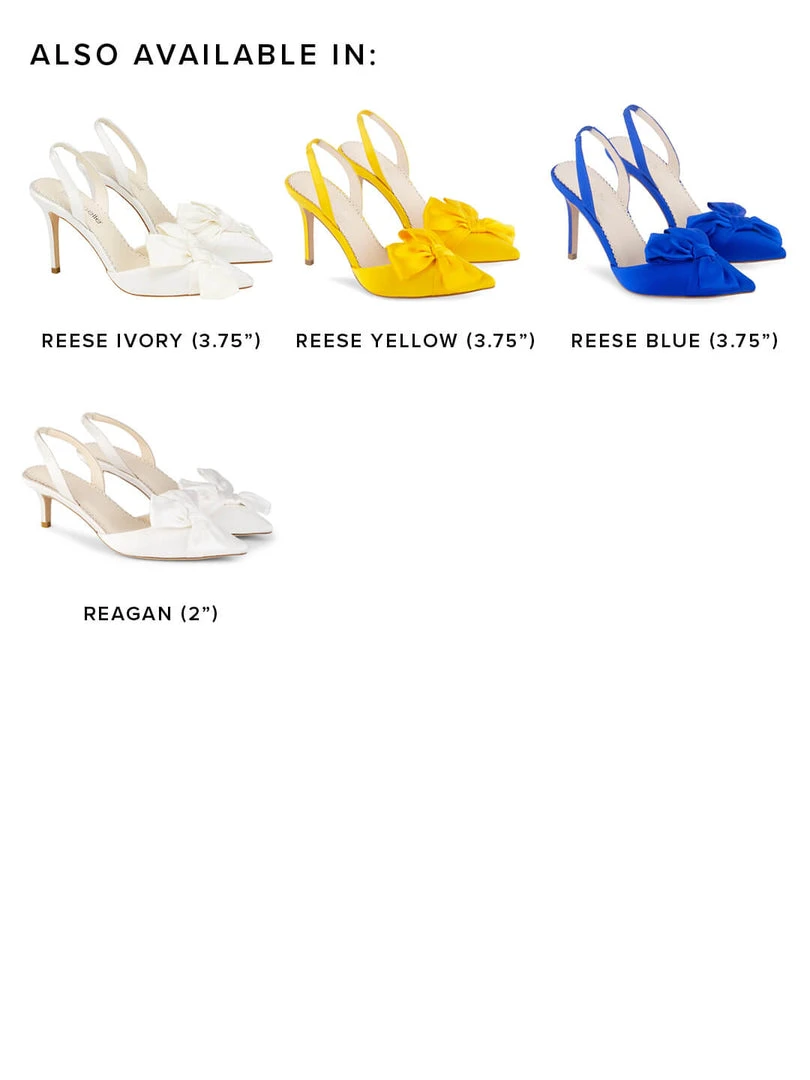 Reagan is made for a modern bride. This refined slingback low heels with bow detailing and a D’Orsay cut create a modern and clean silhouette in Reagan. An oversized silk bow knotted at a diagonal completes this stunning low heel. Reagan’s elegant silk ribbons have the perfect sheen to add an understated polish to these low heels pointed toe with bow detailing.
