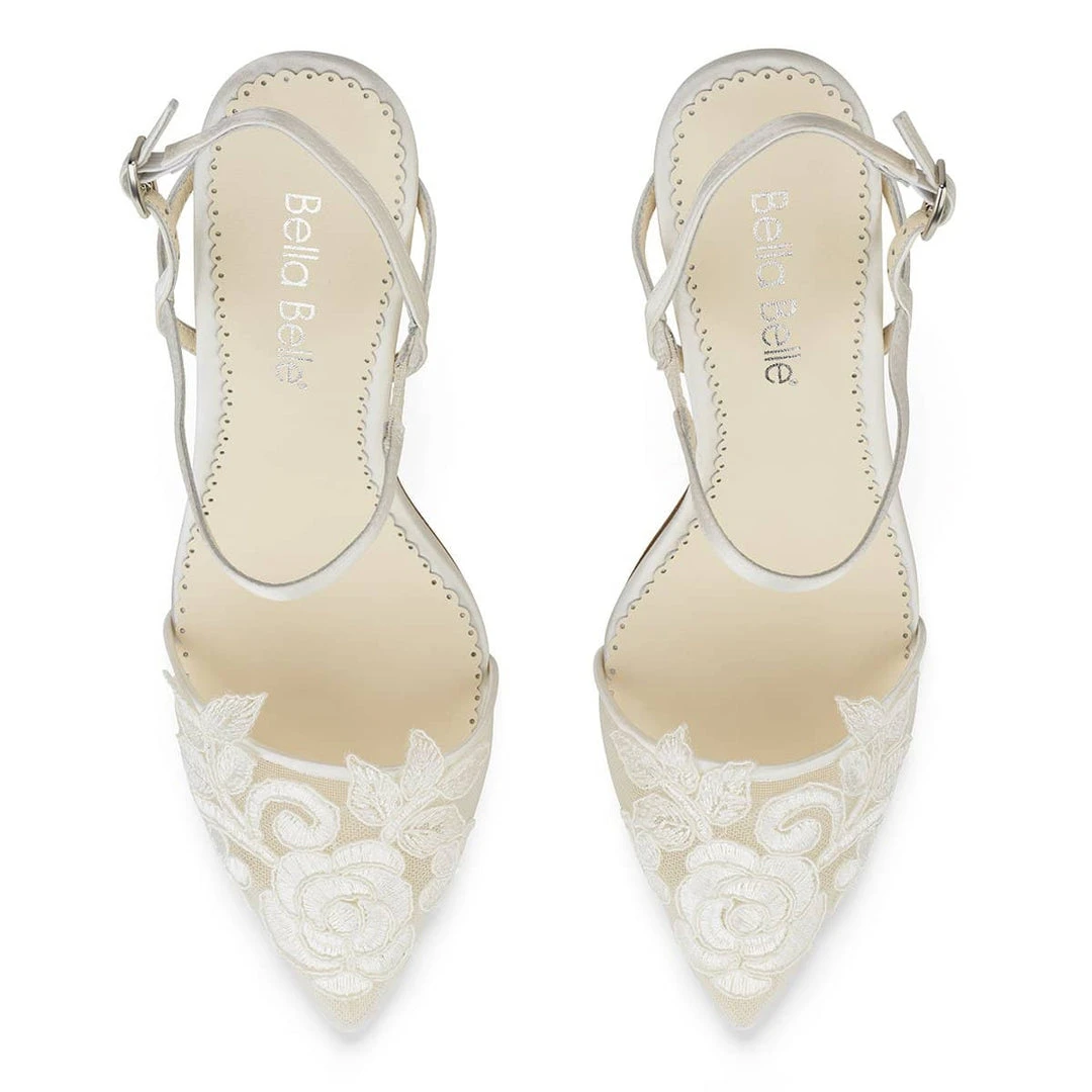 Sylvia flower wedding shoes feature a hand-sewn lace rose at the center of these pointed-toe heels as trailing leaves gently extend past the toe box. Two straps cross at the ankle to carefully secure these ankle strap wedding shoes at the front and back. The classic features of Sylvia vintage lace wedding shoes pair well with both casual and formal dresses.